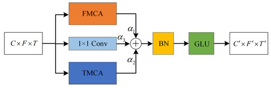 where , , are learnable dynamic parameters with the same initial values of 1/3, is the feature of the FMSA branch outputs, is the feature of the TMSA branch outputs, is the feature of the 1 × 1 Conv branch outputs, and is the feature of the sum of the three branching features.