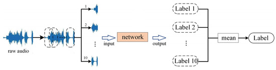 After the introduction of BC learning, the test result for a single audio is the average of its 10 clips’ predictions as shown in Figure 9. The input raw audio is divided equally into 10 clips of length 30,225. Then, 10 clips are fed into the network to output the corresponding labels and take the average of 10 labels as the final label for the audio.