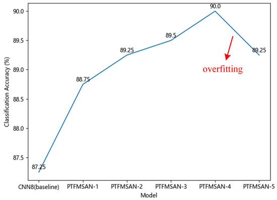 A moderate number of network layers will result in the best network performance. If the number of layers is too small, it will lead to the network being too simple to learn comprehensive features. If there are too many layers in the network, it will lead to the network being too complex, resulting in overfitting. Therefore, it is necessary to choose the appropriate number of PTFMSA layers. CNN8 is used as a baseline model, which consists of four blocks. Each block is composed of two 2D convolutional layers with a kernel size of 3 and a maxpool layer. All convolution layers are followed by a BN and a ReLU layer by default. We changed the number of PTFMSA layers and designed five PTFMSANs of different depths to explore the best network structure as our final PTFMSAN. Table 2 demonstrates the comparison results of five different PTFMSAN structures on the ESC-50. From Figure 10, we can visually see that PTFMSAN-1, PTFMSAN-2, PTFMSAN-3, PTFMSAN-4, and PTFMSAN-5 all outperformed the baseline network, and as the number of PTFMSA layers increases the performance of the network gradually improves. Compared with PTFMSAN-4, PTFMSAN-5 has poorer performance, indicating the onset of overfitting. From this, PTFMSAN-4 is chosen as our final HLFE configuration of the PTFMSAN architecture.