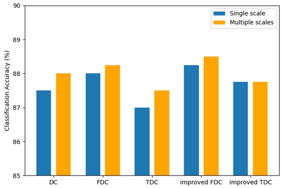 As shown in Table 5 and Figure 11, compared to single-scale dynamic convolution, multi-scale dynamic convolution generally performs better. This can enrich the receptive field of features and makes the features contain more information to avoid the limitations of the convolutional feature. It is clear that multi-scale attention modules are effective. In addition, the proposed improved FDC and improved TDC still outperform FDC and TDC at multiple scales, which also indicate that the improved dynamic convolutions are more compatible with multiple scales.