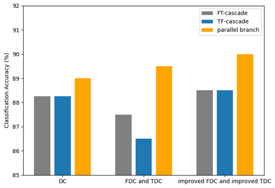 The proposed PTFMSA module applies a parallel branch structure to avoid interference between features of the time domain and the frequency domain. In order to verify the effectiveness of the parallel branch structure, we design a comparison experiment between the cascade structure and the parallel branch structure. In Table 6 and Figure 12, FT-cascade denotes a cascade structure for extracting frequency domain features followed by time domain features, and TF-cascade denotes a cascade structure for extracting time domain features followed by frequency domain features.