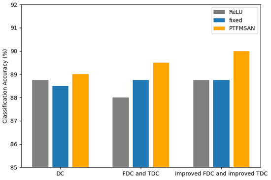 The proposed PTFMSA module applies the GLU activation function instead of the traditional ReLU activation function and uses learnable dynamic parameters to adjust the weights of the different branches. In order to verify their effectiveness, we design a comparison experiment. In Table 7 and Figure 13, fixed denotes the parameters α1, α2, α3, which in Equation (14) are all set to a fixed value of 1/3 instead of participating in the network training, and ReLU denotes the model that replaces the GLU of the PTFMSA module with the ReLU activation layer.