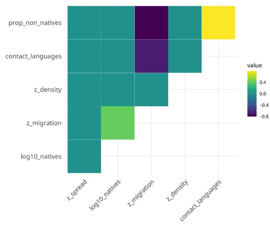 In contrast, the full model for syntactic complexity converges with a singular fit. Initial model inspection furthermore revealed harmful collinearity for the trigger contact languages indicated by a variance inflation factor of and moderate correlation for proportion of non-native speakers (). Collinearity is addressed by removing the number of contact languages from the model but retaining the proportion of non-native speakers. This is justified as both triggers are highly positively correlated (r = 0.79, ; see also Figure 1).