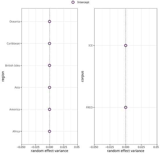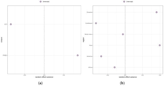 The major variance in morphological complexity, then, is accounted for by the highly statistically significant random effects for corpus () and region (, ). As a matter of fact, there is ample evidence suggesting that variation in morphological complexity is mainly accounted for by random structures including geography and phylogeny, or effects are not significant when controlling for these random effects [20,21,54]. As can be seen in Figure 5a, the random effects variance for varieties/texts sampled in ICE is negative, whereas the random effects variance for varieties/texts in FRED is positive. This indicates that morphological complexity ratios for ICE varieties are generally lower than for FRED varieties. In terms of region, the picture is more varied. Suffice it to say that the random effects variances for Asia, Oceania, and the Caribbean are the largest, and for the British Isles the smallest.
