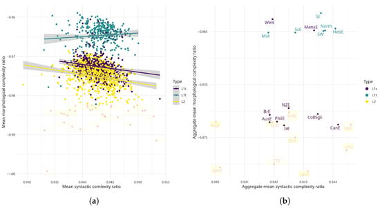 Spoken English varieties by morphological and syntactic complexity and language type. Abscissa indexes increased syntactic complexity; ordinate indexes increased morphological complexity. (a) Varieties as individual text files. (b) Complexity aggregated by variety.