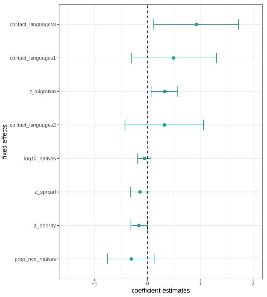 In addition, confidence intervals for the fixed effects were calculated as plotted in Figure 4. The large confidence intervals for contact languages and the proportion of non-native speakers show that there is a lot of uncertainty in estimating these effects. Furthermore, all three levels for contact languages cross the zero boundary and should thus not be considered significant (despite the likelihood ratio tests). Similarly, the confidence intervals for number of native speakers, proportion of non-native speakers, and geographic spread all cross the zero boundary. The non-significance and large uncertainty represented by the large confidence intervals for these triggers is in line with the controversial findings in the typological literature [16,19,20,21]. The only effects not crossing the zero boundary are net migration rate and population density, which thus both have a significant effect on morphological complexity, conditioned on the random effects structure.