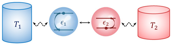 Let us consider two coupled two-level atoms (TLAs) interacting with a distinct thermal reservoir, respectively, as shown in Figure 1. The model has been widely studied in various cases [57,58,59,60]. The total Hamiltonian of the system and the reservoirs is