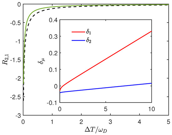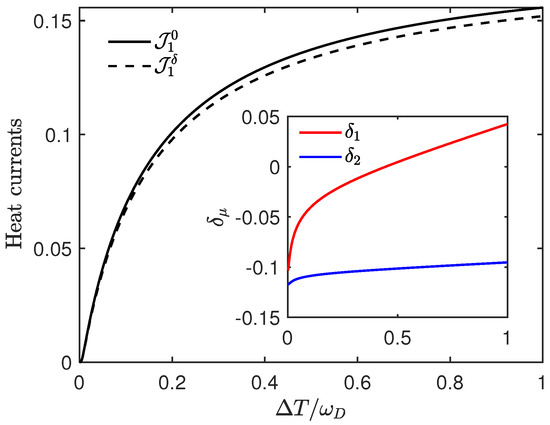 The error of this estimation is clearly illustrated in Figure 2, and we can observe a constant increasing as the temperature increases from the inset. A more detailed discussion on this is provided in Appendix B. Note that the negative initial value of suggests the Lamb shift’s effect on heat current from reducing to enhancing contributions with increasing temperature difference.