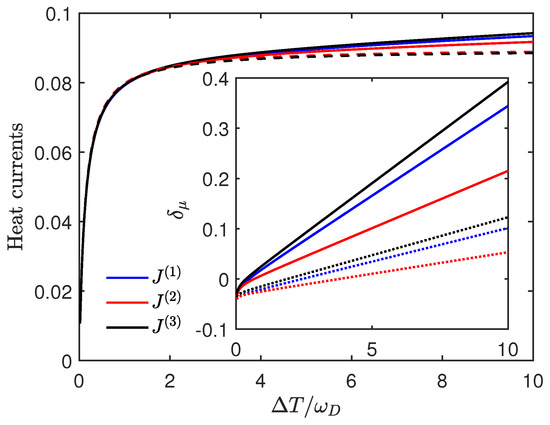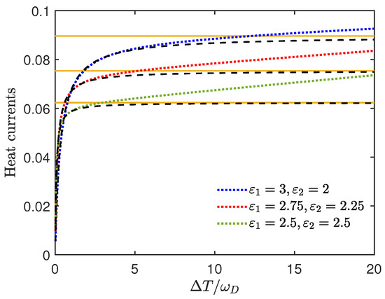 This indicates that the increases linearly with the temperature difference in the regime . That is, the heat current with the Lamb shift in the regime , the sum of and , can exceed the upper bound Equation (47) due to the linearly increasing . Such a result is also explicitly illustrated in Figure 5. It can be seen that at slight temperature differences, the dashed line is below the dotted line, but the difference is not significant. With the temperature increasing, all the dashed lines are tightly below the corresponding orange solid line. In contrast, the dotted lines increase linearly and exceed the supremum corresponding to the orange solid line. In addition, it can be observed that when is a constant, the smaller the is, the smaller the temperature difference is at which the heat current with the Lamb shift surpasses the supremum of the heat current corresponding to the orange solid line.