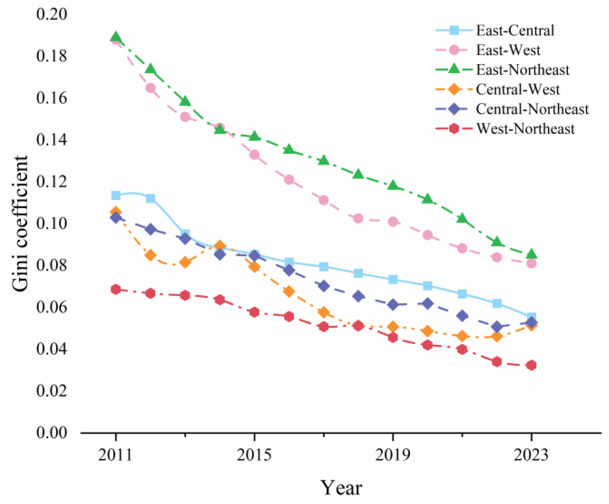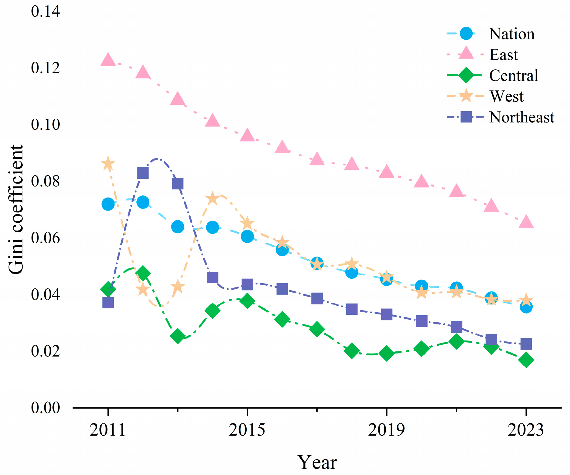 To fully reveal the characteristics of disparities in China’s CCD-URBE, after analyzing the overall disparities and intra-regional disparities, this study continued to use the Gini coefficient to measure disparities between different regions. This provides a quantitative basis for precise policy-making in different regions.