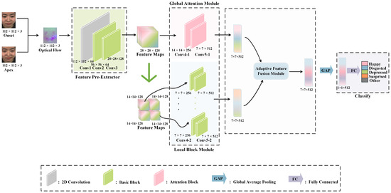 The success of end-to-end deep neural networks in various computer vision tasks has provided new insights for MER, with automatic learning methods such as convolutional neural networks (CNNs) gradually becoming mainstream in the field of MER. To more accurately capture subtle and discriminative features in MEs, researchers often first locate facial landmarks to identify regions of interest (ROIs), then crop these regions or apply masking to non-ROIs areas in order to extract local detail features [10,11,12]. However, such approaches often overlook two key issues: first, there may be overlapping regions between partitions, leading to redundant information and causing the model to overemphasize repeated features; second, while masking can highlight specific regions, it may also obscure context information relevant to expressions, thereby limiting the model’s ability to understand overall expression dynamics. These issues ultimately reduce the accuracy of MER. Unlike previous works, to avoid redundant information caused by overlapping regions, we design a simple yet effective Local Block (LB) module. The core idea of this module is to divide the feature map into non-overlapping local regions and decompose the deep residual network of ResNet into the corresponding number of branches. Each branch disregards the global background and focuses solely on a specific key facial region to extract features. By independently learning local discriminative features, the network’s sensitivity to fine-grained ME variations is enhanced, thereby improving recognition performance. Meanwhile, to prevent the model from overly concentrating on local details while neglecting crucial global features, we further design a Global Attention (GA) module. This module integrates a global attention mechanism into the basic residual block. By combining channel and spatial attention mechanisms, along with multilayer perceptrons and 3D convolutional structures, the GA module effectively reduces the dispersion of feature information, strengthens global interaction modeling, and ultimately improves the overall performance of the model.