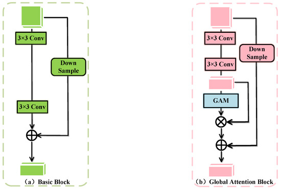 CNNs rely on the local receptive fields of convolutional kernels, which typically focus only on limited regions of the feature map, making it difficult to model long-range dependencies or global context. To address the limitations of ResNet in global feature extraction, we introduce a Global Attention Mechanism (GAM) [43] into its basic residual block, thereby constructing the GA module. The structure of the basic residual block in ResNet is shown in Figure 2a, and the architecture of the GA module is illustrated in Figure 2b. By combining the strengths of the Channel Attention Mechanism (CAM) and the Spatial Attention Mechanism (SAM), GAM captures salient features across three dimensions—channel, spatial width, and spatial height—thus mitigating the loss of critical information and the lack of cross-dimensional feature interaction caused by the convolution process in CNNs.
