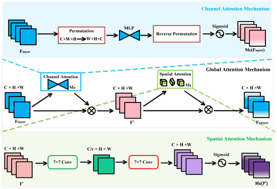 Figure 3 illustrates the implementation principle of the GAM, where input features pass through CAM and SAM sequentially, and are processed through a basic multiplication operation. The implementation formula of GAM is as follows: