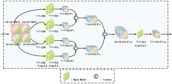 Finally, a basic residual network block is added, which includes a convolutional layer with 512 input channels and 512 output channels, with a stride of 2. This final feature map is processed through this convolutional layer to yield a new feature map of size . By adding this convolutional layer, we reduce the spatial dimensions of the feature map while preserving important information, thereby facilitating efficient integration with the extracted global features.