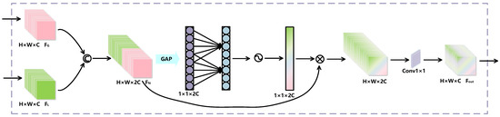 Firstly, the input data consists of global features and local features . These features are concatenated along the channel dimension to form a new feature map . Then, is processed through the ECA module. The principle of the ECA attention mechanism is to perform local cross-channel interaction using one-dimensional convolution, avoiding information loss caused by dimensionality reduction and fully leveraging spatial and temporal channel information. The specific implementation steps are as follows: