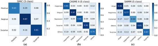 Confusion matrix of classification results under the SDE standard: (a) confusion matrix of the three-class classification results for the SMIC database, (b) confusion matrix of the five-class classification results for the CASME II database, (c) confusion matrix of the five-class classification results for the SAMM database.