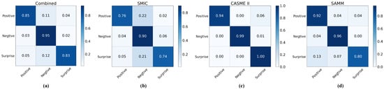 Confusion matrices of classification results under the CDE criterion: (a) confusion matrix of the composite database for the three-class classification, (b) confusion matrix of the SMIC database for the three-class classification, (c) confusion matrix of the CASME II database for the three-class classification, (d) confusion matrix of the SAMM database for the three-class classification.