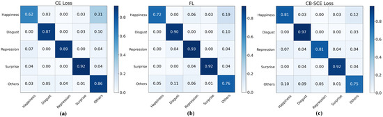 To visually demonstrate CB-SCE loss’s effectiveness in alleviating class imbalance issues, we have plotted confusion matrices under different loss functions, as shown in Figure 8. Observing these matrices, we can clearly see that both FL and CB-SCE loss improve the accuracy of the ‘Happiness’ and ‘Disgust’ categories, which had relatively low accuracy with CE loss, with CB-SCE loss showing a more significant enhancement. Although the accuracy of the ‘Others’ category was also relatively low with CE loss, both FL and CB-SCE loss show a decline in accuracy for this category. This phenomenon may be attributed to the fact that the “others” category constitutes 40% of the total sample size, meaning that this category has a relatively larger number of samples. FL and CB-SCE loss have a more noticeable effect on categories with fewer samples, thus their performance on larger categories may not meet expectations. These results indicate that CB-SCE loss outperforms FL and CE loss in addressing class imbalance issues, especially in significantly improving the classification performance of minority classes.