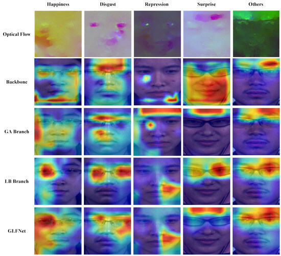Finally, we visualized the feature maps generated by GLFNet. The results confirmed the effectiveness of our previous work, as the visualization results of GLFNet successfully integrated the characteristics of both the GA and LB branches. GLFNet accurately captured motion features in different emotional expressions and localized muscle movement regions with higher precision.