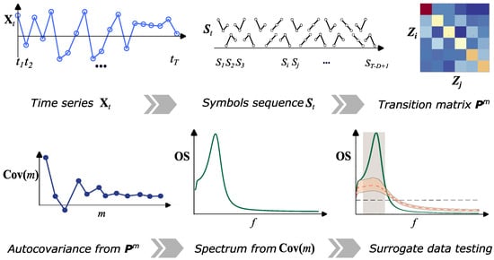 Workflow for computing the ordinal spectrum. Top: From a time series of length T, ordinal patterns with, e.g., embedding dimension D and delay are constructed to produce the symbolic sequence over the permutations (state space ). A first-order transition matrix is then estimated from consecutive symbols. Bottom: The rank autocovariance is computed across lags m and its spectral representation yields the ordinal spectrum (Equation (3)). Comparison with IAAFT surrogate spectra highlights the frequencies where significantly deviates from those values obtained with linear, correlation-preserving dynamics.