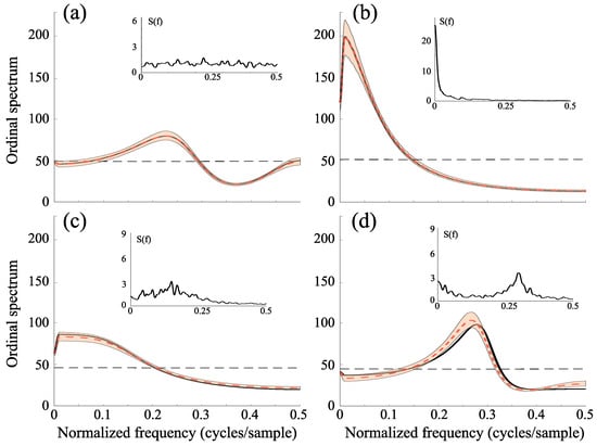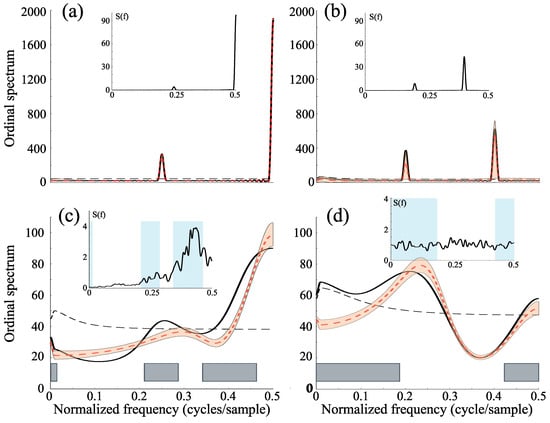 Main plots in Figure 2a,b show that, despite the large peaks observed in the ordinal spectrum, the dynamical properties of the periodic process are not statistically different from those replicated by the surrogate data and thus, the null hypothesis cannot be rejected at any frequency. As expected for chaotic sequences, results in Figure 2c,d indicate that the ordinal spectrum identifies frequency ranges in which the dynamics significantly deviate from the surrogate data, thereby revealing signatures of increased dynamical complexity.