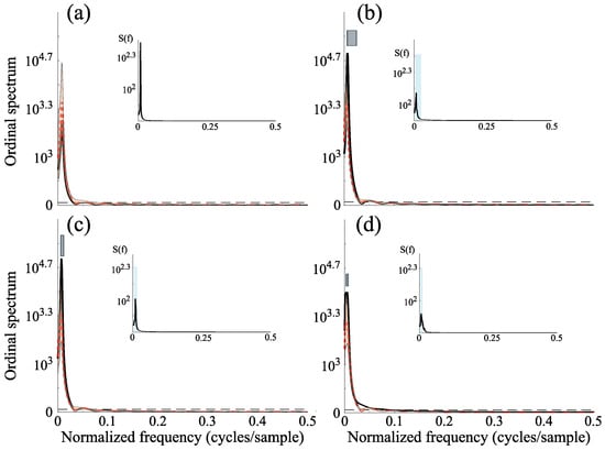 Ordinal spectra as a function of normalized frequency (black curves) for time series generated by the logistic map with embedding parameters and : (a) periodic dynamics at ; (b) periodic dynamics at ; (c) chaotic dynamics at ; and (d) chaotic dynamics at . Gray boxes in the main panels highlight frequency regions where the ordinal spectra differ significantly from those obtained with surrogate data. Slashed black curves represent the average spectra from randomized symbolic sequences (not from IAAFT surrogates). Orange shaded regions and inner slashed red curves denote the 5th–95th percentiles and the average spectra across IAAFT surrogates, respectively. Insets show the power spectra of the original time series (normalized frequency), with blue shading the frequency bands identified in .