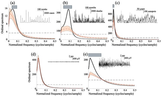 Ordinal spectra (black curves) of real-world data. Insets display the original time series with their respective temporal and amplitude scales. (a) Measles cases (, ); (b) cholera data (, ); (c) sunspot numbers (, ); (d) interictal EEG; and (e) EEG during an epileptic seizure (, ). Slashed curves represent the average spectra from randomly shuffled symbolic sequences. Gray boxes in the main panels indicate frequency ranges where the ordinal spectra differ significantly from those of surrogate data. The same conventions as in Figure 2 are used.