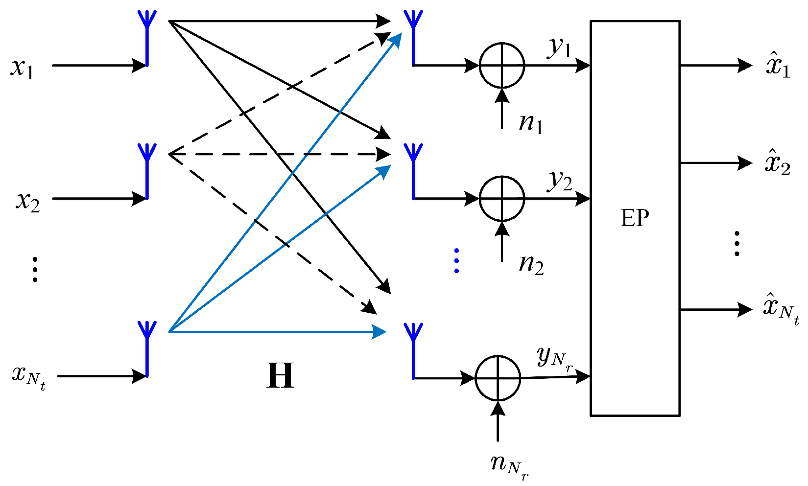 - Yao, G.; Chen, H.; Hu, J. An improved expectation propagation based detection scheme for MIMO systems. IEEE Trans. Commun. 2021, 69, 2163–2175. [Google Scholar] [CrossRef]