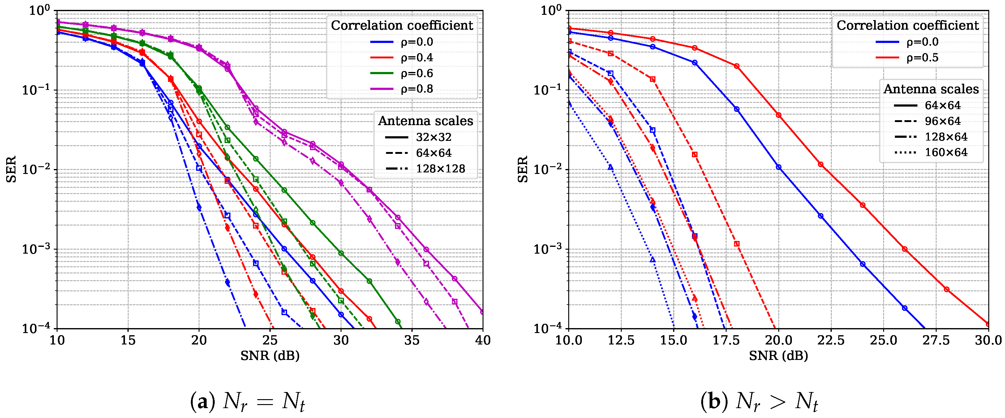 - Chen, Y.; Feng, H.; Song, S.; Wang, Z. Correlated Channel-Oriented Expectation Propagation-Based Detector for Massive MIMO Systems. IEEE Trans. Circuits Syst. I Regul. Pap. 2024, 71, 1429–1442. [Google Scholar] [CrossRef]