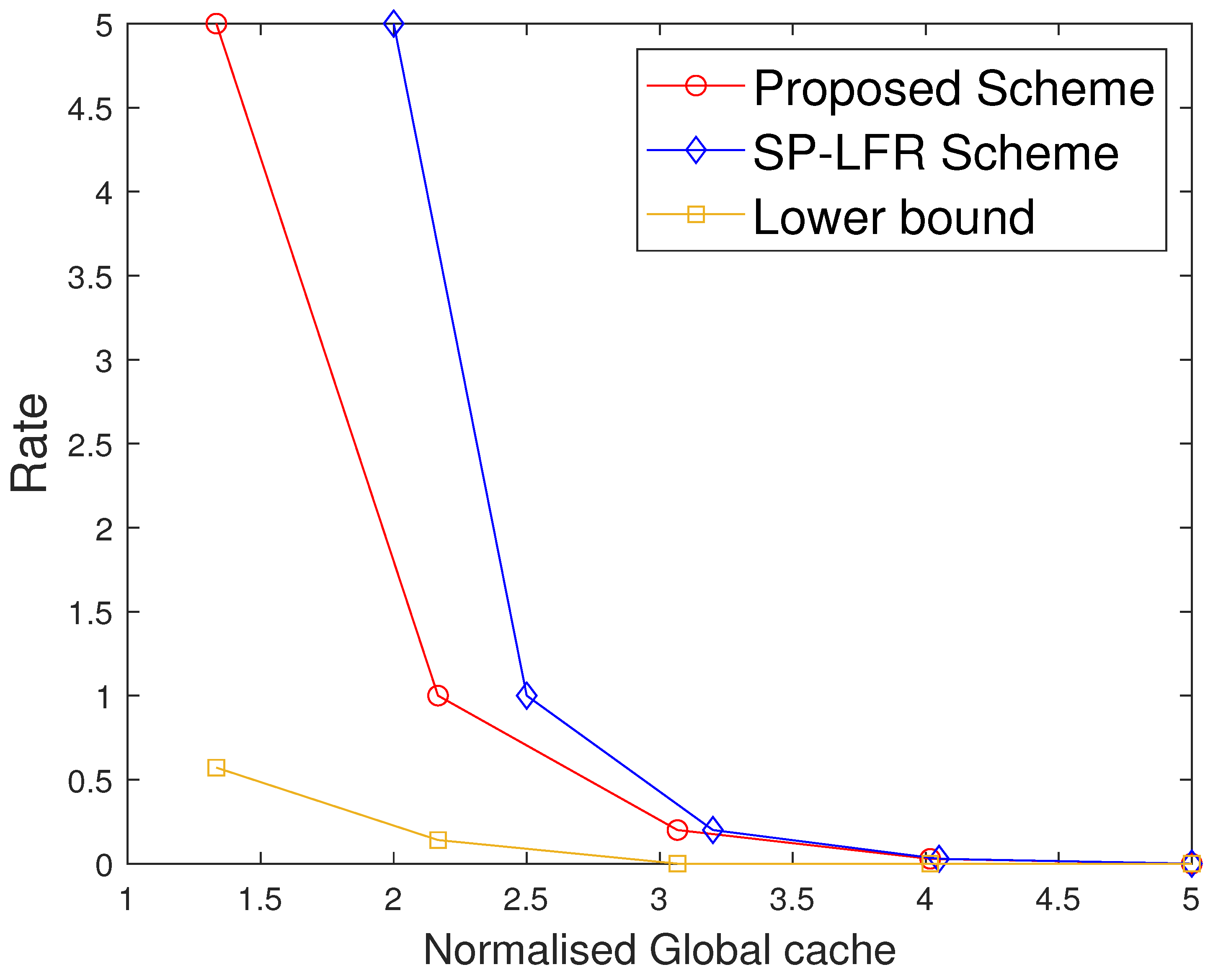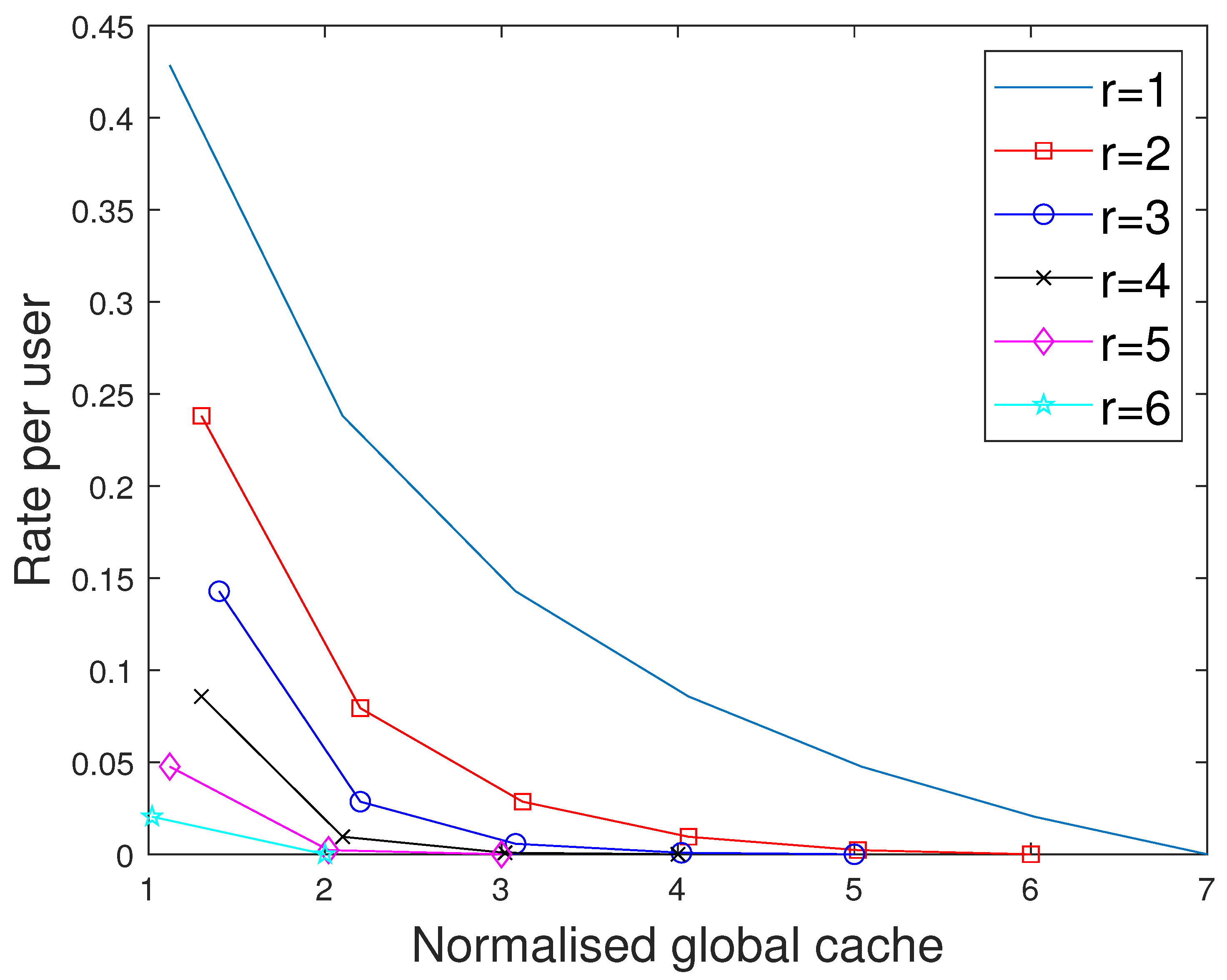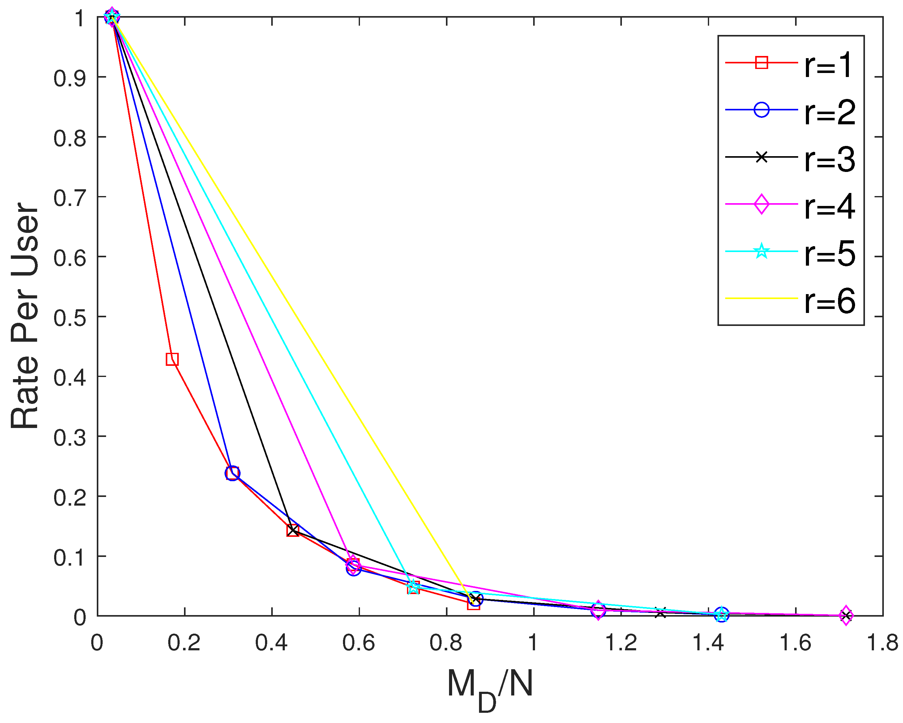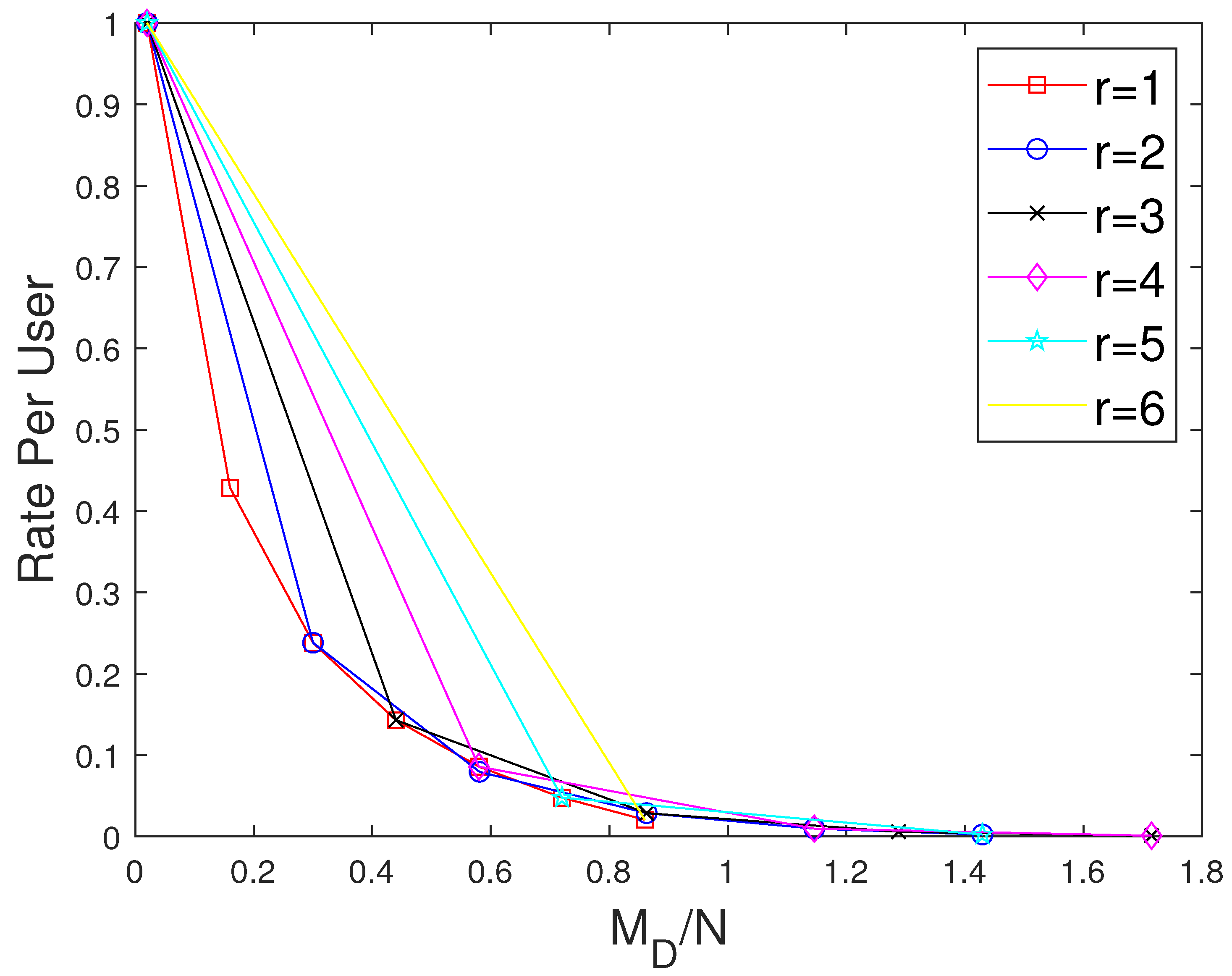 - Next, we compare the proposed scheme with the scheme developed for the dedicated cache setup in [15]. The proposed scheme reduces to the dedicated cache setup in [15] when . We first consider the case where both setups have the same number of caches. In the dedicated cache setup, the number of users is equal to the number of caches. However, in the combinatorial topology with private caches, the total number of users exceeds the number of caches. To enable a fair comparison under this setting, we use the metric of rate per user, defined as the rate divided by the total number of users. This metric was previously used in [3,7]. Next, we consider a comparison in which both the dedicated cache setup and the combinatorial topology with private caches serve the same number of users, and the total global cache size is also kept equal across both setups.