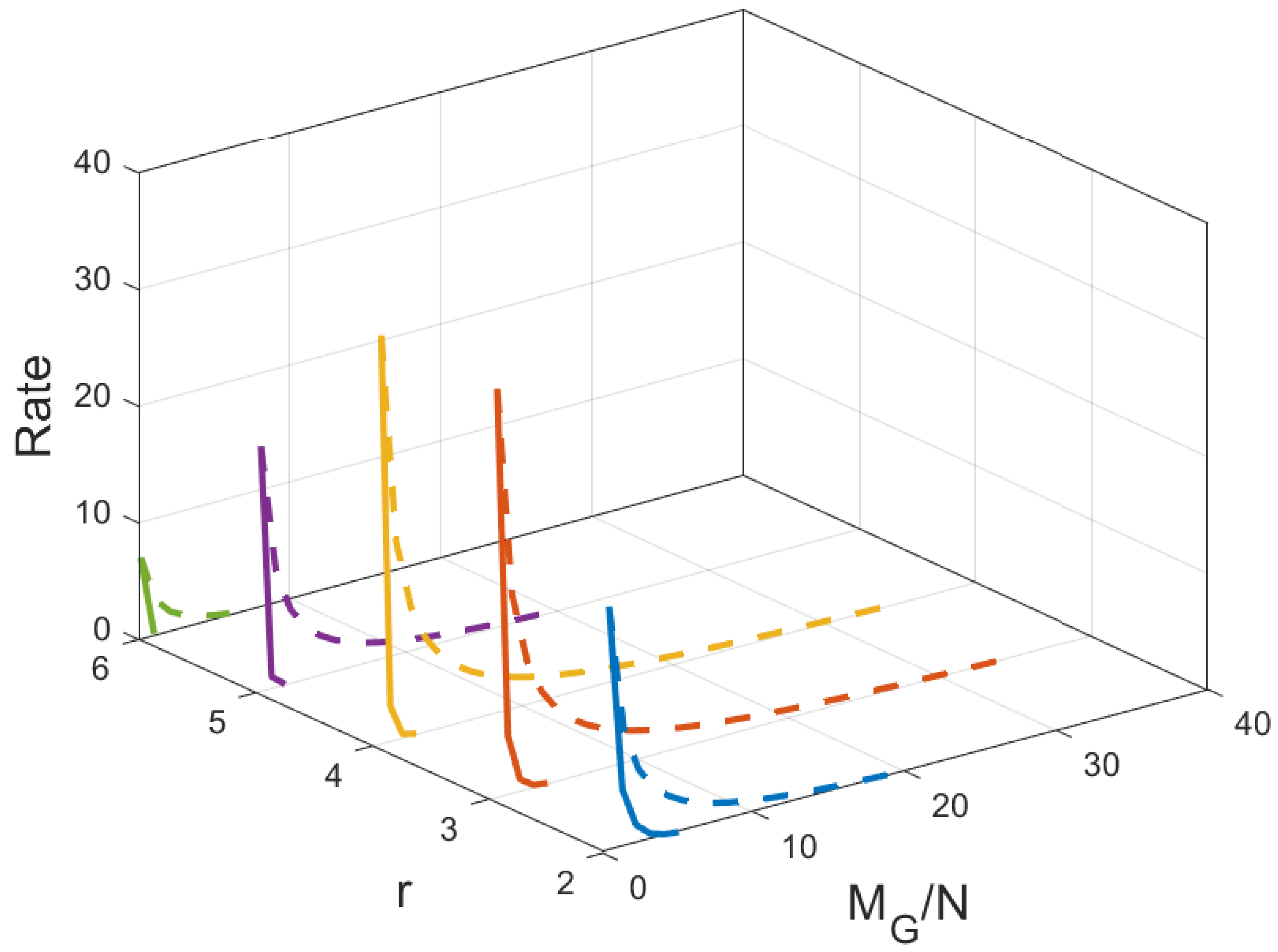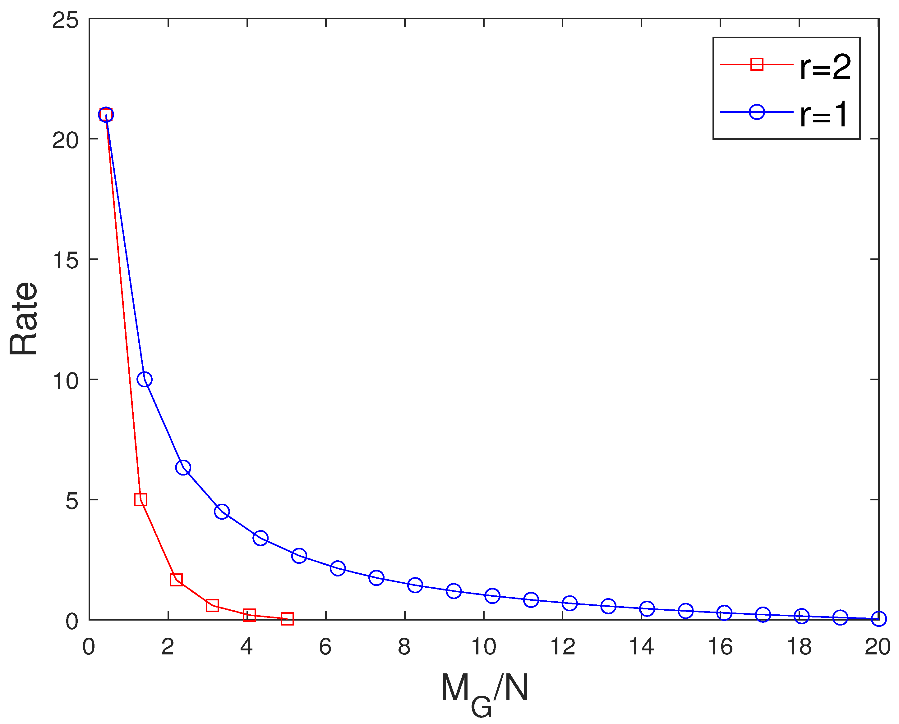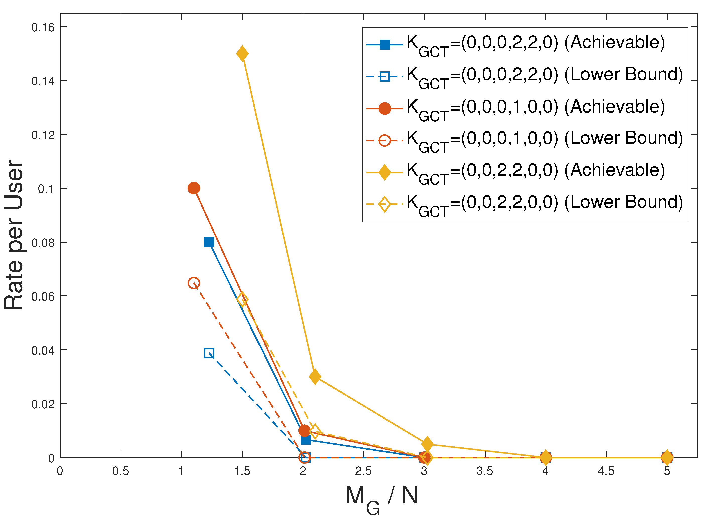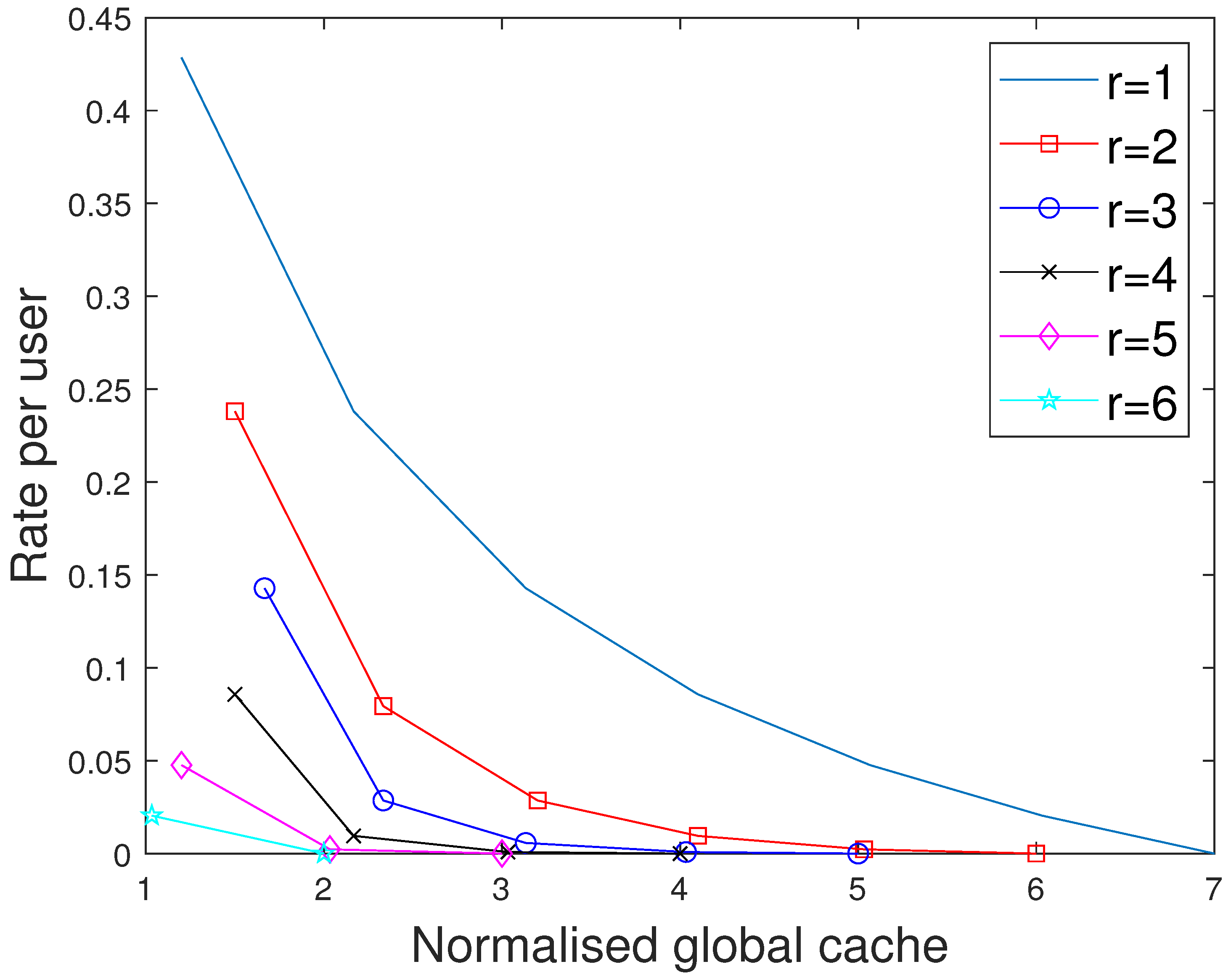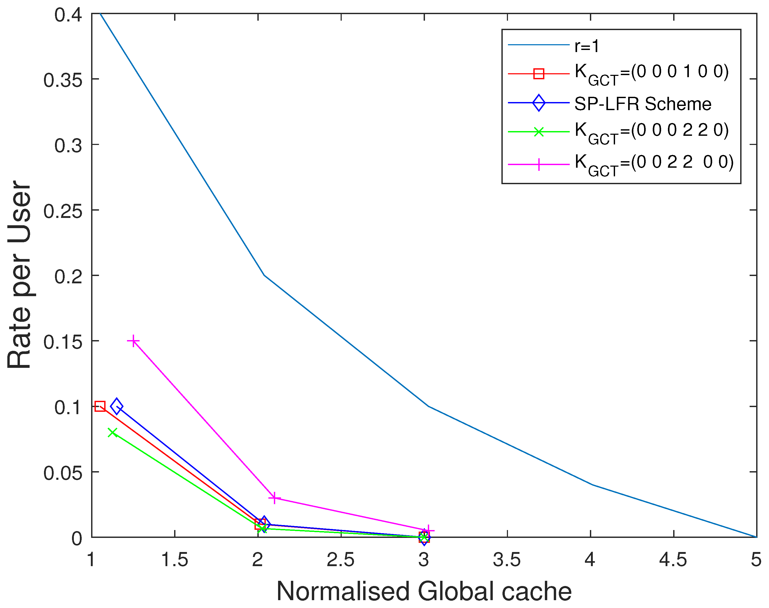 - Next, we compare the proposed scheme with the scheme developed for the dedicated cache setup in [15]. The proposed scheme reduces to the dedicated cache setup in [15] when . We first consider the case where both setups have the same number of caches. In the dedicated cache setup, the number of users is equal to the number of caches. However, in the combinatorial topology with private caches, the total number of users exceeds the number of caches. To enable a fair comparison under this setting, we use the metric of rate per user, defined as the rate divided by the total number of users. This metric was previously used in [3,7]. Next, we consider a comparison in which both the dedicated cache setup and the combinatorial topology with private caches serve the same number of users, and the total global cache size is also kept equal across both setups.