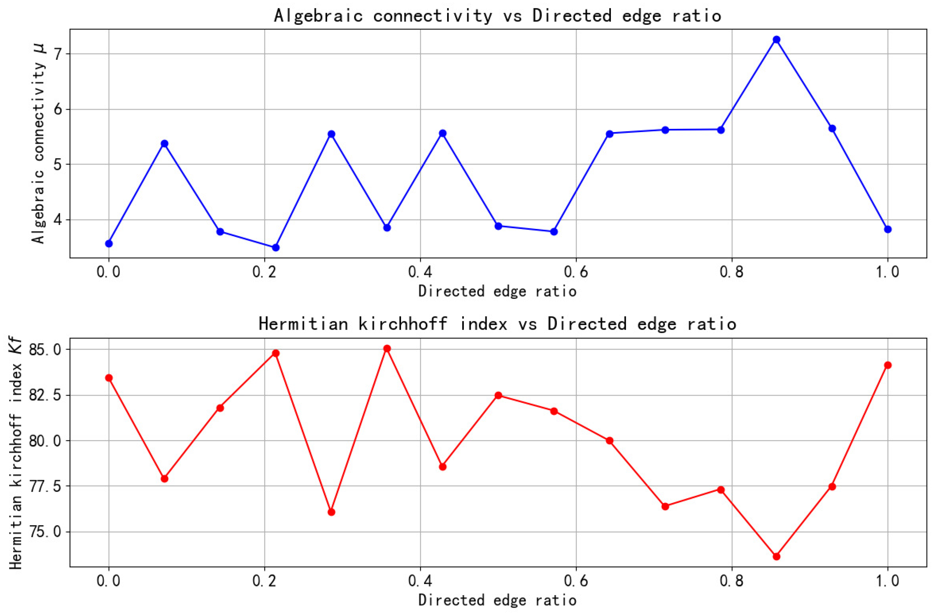 index and the algebraic connectivity are exactly opposite. With the increase in the proportion of directed edges, the algebraic connectivity develops in a cyclical trend of “first increase and then decrease”, while the