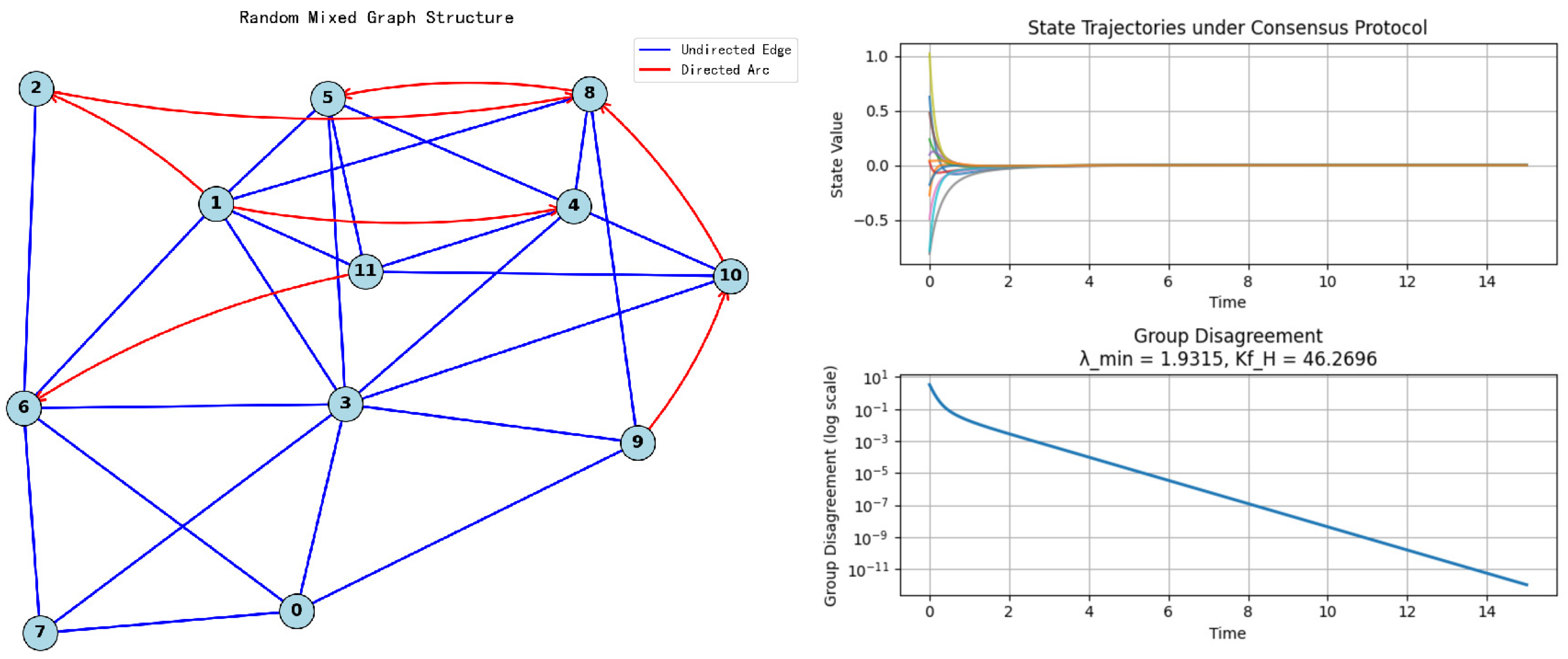 29] constructed the Hermitian resistance matrix and the Hermitian Kirchhoff index from the eigenvalues and eigenvectors of the Hermitian Laplacian to assess connectivity and robustness of hybrid networks. Given the relationship between the Hermitian Kirchhoff index and algebraic connectivity, a natural question arises: can the Hermitian Kirchhoff index serve as a metric for the consensus convergence rate of multi-agent systems whose interaction topology is a hybrid network?