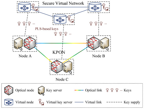 The secure virtual network layer is constituted by a number of secure virtual networks, which are abstracted from the substrate KPON layer. A secure virtual network consists of several virtual nodes interconnected by virtual links, where the virtual key servers present in each virtual node are abstracted from the corresponding key servers. Specifically, a subset of keys with information-theoretic security is virtualized from the key server and stored in the virtual key server, in order to satisfy the corresponding security requirements of each virtual network. In reality, multiple secure virtual networks can share the bandwidth and key resources over the same KPON.