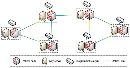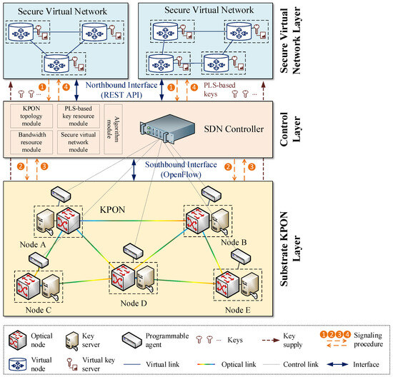 In order to ensure the effective implementation of the aforementioned process for securing virtual networks with information-theoretically secure keys from the KPON, it is advisable to introduce the SDN technique, which allows for the centralized management of the KPON via a logical control approach. The feasibility of introducing the SDN technique with an efficient global control capability for virtual network construction has been confirmed in previous studies [24,25]. Accordingly, the implementation of secure virtual network provisioning over KPONs can rely on the SDN-based layered architecture shown in Figure 2. This layered architecture comprises three layers, arranged in a top-down sequence, i.e., the secure virtual network layer, the control layer and the substrate KPON layer. The substrate KPON layer is constituted of a number of substrate nodes interconnected by substrate fiber links. Each substrate node comprises an optical node and a key server. The keys with information-theoretic security are generated between each pair of optical nodes and their life cycles are managed by the corresponding key servers. In addition, each substrate node is linked to a programmable agent to facilitate its adaptive configuration.
