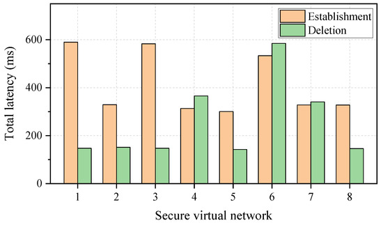 Figure 4 displays the establishment and deletion latencies for secure virtual networks. The number of virtual nodes for each virtual network is set to 3, while the PLS-based key requirement and bandwidth requirement are set to 100 bps and 50 GHz (i.e., a wavelength channel), respectively. The total latency represents the time interval between the arrival of the secure virtual network establishment/deletion request and the reception of the establishment/deletion response. It can be observed that the total latencies exhibit variability across different secure virtual networks. In the case of the emulated eight requests, the minimum and maximum total latencies for the establishment of the secure virtual network are 300.5 ms and 589.9 ms, respectively. In addition, the minimum and maximum total latencies for the deletion of the secure virtual network are 142.6 ms and 584.8 ms, respectively. Hence, even though the total latency may fluctuate, the millisecond latency for the establishment/deletion of a secure virtual network over the KPON can be achieved.