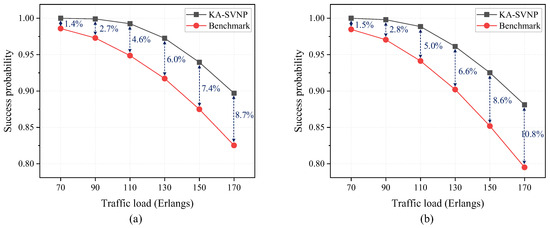 Figure 7 presents a comparative analysis of the proposed KA-SVNP algorithm and the benchmark algorithm in terms of the success probability of secure virtual network requests, where the scenarios without bandwidth limitation and with bandwidth limitation are considered in Figure 7a,b, respectively. The benchmark algorithm is the traditional virtual network provisioning algorithm with stochastic available path selection, which does not take into account the key adaption. The key requirement for each secure virtual network request is randomly selected from the interval [1,4] kbps, while the information-theoretically secure key resources (i.e., key rates) for each substrate link are 50 kbps. In Figure 7a, the number of bandwidth resources is sufficient. In Figure 7b, each substrate link provides 40 wavelength channels (each at 50 GHz) of bandwidth resources, while each secure virtual network request requires one wavelength channel at 50 GHz. From Figure 7 we can see that the proposed KA-SVNP algorithm demonstrably outperforms the benchmark algorithm in both scenarios. For example, when the traffic load is 170 Erlangs, the improvement in the success probability of secure virtual network requests for the KA-SVNP algorithm relative to the benchmark algorithm can reach 8.7% and 10.8% in the scenarios without bandwidth limitation and with bandwidth limitation, respectively, thereby demonstrating the efficiency of the proposed KA-SVNP algorithm. Hence, the key supply (i.e., the information-theoretically secure key resources for each substrate link) and key demand (i.e., the key requirement of the secure virtual network request) can be adaptive by the selection of the physical path with the maximum value of in the proposed KA-SVNP algorithm.