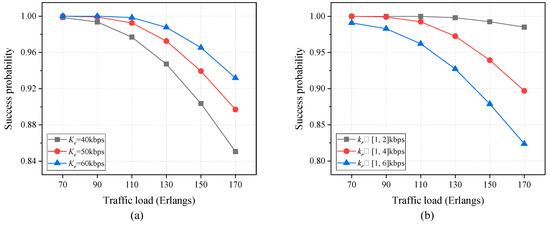 The results of the success probability of secure virtual network requests as a function of traffic load are plotted in Figure 8, where the scenario without bandwidth limitation is considered. In Figure 8a, the comparative analysis of different information-theoretically secure key resources is presented, where the key requirement for each secure virtual network request is randomly selected from the interval [1,4] kbps. In addition, Figure 8b illustrates the comparison of different key requirements, with the PLS-based key rate for each substrate link set at 50 kbps. It can be seen that the success probability of secure virtual network requests declines progressively as the traffic load rises. This is due to either an increase in the arrival rate or a decrease in the departure rate. As shown in Figure 8a, an increase in the PLS-based key rate results in a corresponding rise in the success probability of secure virtual network requests, due to the expansion of the total available key resources. As illustrated in Figure 8b, the success probability of secure virtual network requests declines in conjunction with an increase in key requirements. This is due to an increase in the total key requirements. Consequently, in order to accommodate a larger number of secure virtual network requests, it may be necessary to either increase the value of or reduce the range of . However, this may result in a trade-off between cost and flexibility.