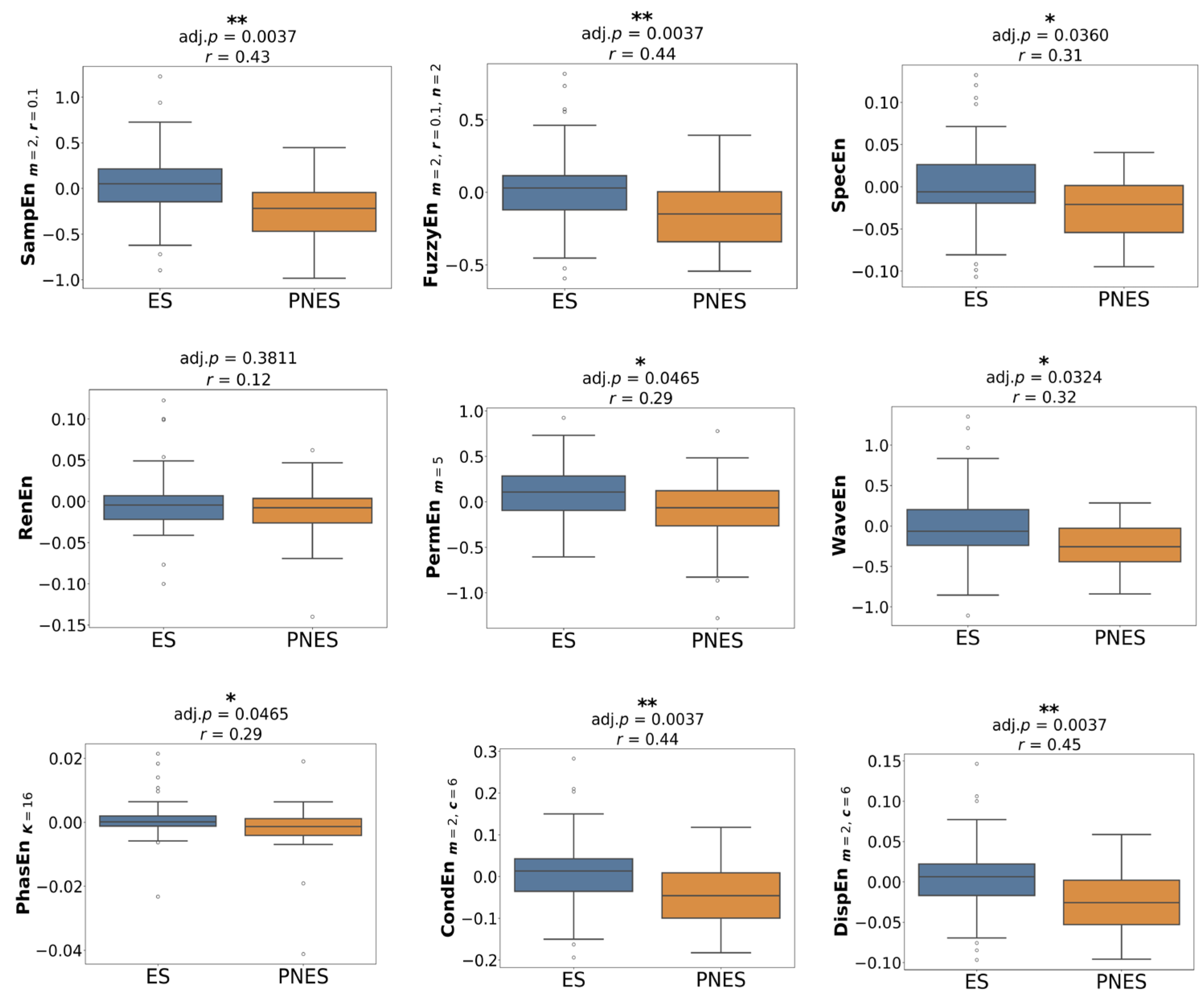 To assess group-level differences in entropy features between patients with epileptic ES and PNES, we used the non-parametric Mann–Whitney U test (