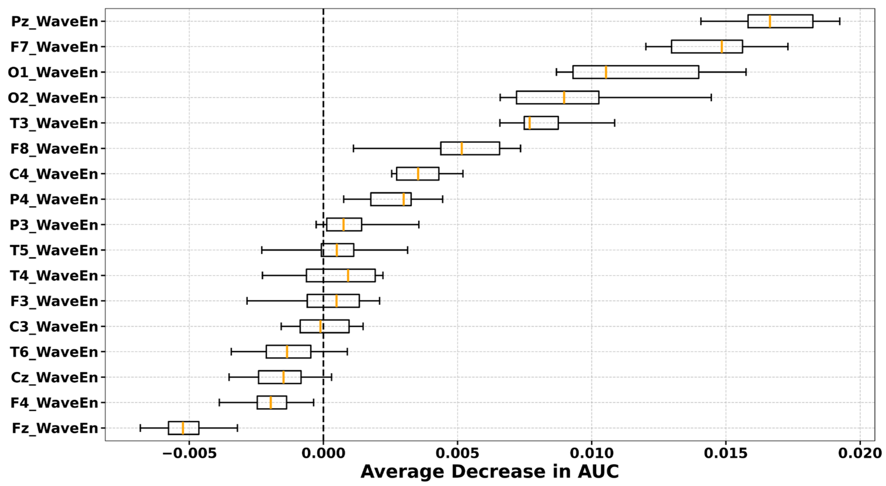 Within each training fold, permutation importance was applied to identify informative electrodes for each entropy measure. A model was trained and validated, and individual channels were permuted independently over ten repetitions. The mean reduction in AUC across the inner five validation folds was taken as the importance score, with larger reductions indicating greater channel importance. Channels showing consistently positive mean importance were retained, thereby reducing the number of electrodes from the original 17 to a smaller subset determined by their importance ranking. The same selected channels were then applied to the held-out test subject to ensure consistent dimensionality reduction. Following class balancing and channel selection, the training feature matrix was reduced from (73 × 12, 17) to (N × 12, C), where N (N < 73) is the number of subjects after undersampling and C (C < 17) is the number of selected channels.