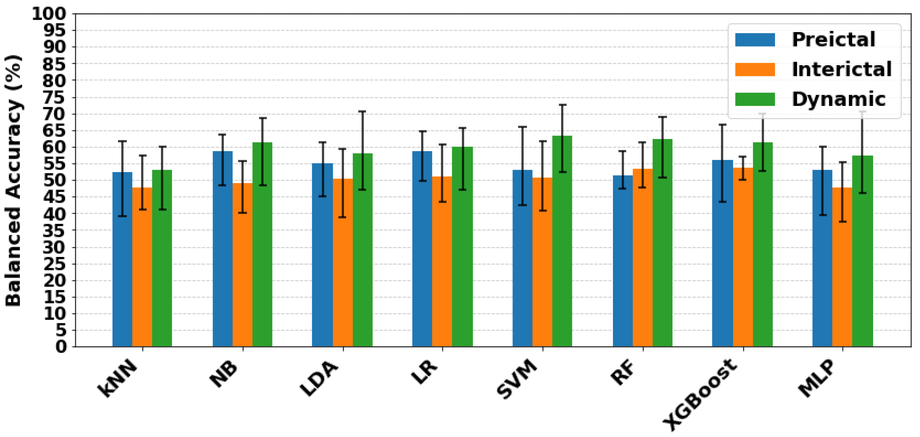 Classification results confirmed these findings by showing that dynamic entropy features returned the best generalisation performance across unseen subjects. At the classifier level, SVM showed the most robust performance in the dynamic state, reflecting its ability to exploit non-linear boundaries in temporally varying features. In contrast, during the preictal state, simpler models such as NB and LR achieved better classification across the entropy measures, suggesting that linear or probabilistic approaches may be more effective in discriminating PNES from ES in the preictal period. Across all conditions, preictal performance generally exceeded interictal, but both were outperformed by dynamic state.