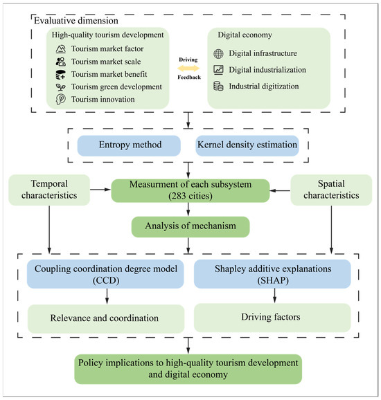 Tourism has long been recognised as a key driver of economic growth, enhancing the well-being of residents and fostering regional development. In 2023, the tourism sector contributed 4.24% to China’s GDP [1]. However, with the rapid growth of the Chinese tourism industry, the traditional model of quantity-driven development is no longer sufficient to meet its evolving needs. Several United Nations Sustainable Development Goals (SDGs), including SDG 11, SDG 13, SDG 14, and SDG 15, are closely linked to tourism development, particularly in the areas of ecology, urbanisation, and sustainability [2]. Consequently, there is a pressing need for the Chinese tourism industry to undergo transformation and upgrade to achieve high-quality development. As a highly information-intensive industry, tourism is increasingly shaped by the digital economy, which plays a critical role in fostering its high-quality growth. The rapid advancement and application of digital technologies offer both unprecedented opportunities and challenges to the sector. The digital economy has revitalised tourism, driving innovation, transformation [3], and improvements in service quality and efficiency [4]. Additionally, it has introduced new business models and development paradigms. In response, the Chinese Ministry of Culture and Tourism, together with the National Development and Reform Commission, issued a joint directive promoting the deep integration of “Internet + Tourism” by 2025, aiming to position the digital economy as a key driver of the tourism sector’s transformation and high-quality development. In this context, it is particularly crucial and urgent to examine the coupling and coordination between high-quality tourism development and the digital economy. Such an analysis can provide a reference for policymakers to promote the integration of high-quality development of tourism and the digital economy.