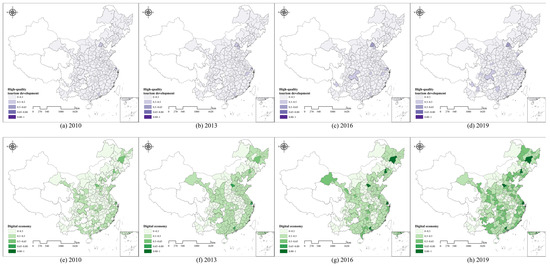 Figure 3e–h demonstrates that from 2010 to 2019, the level of DE development in most Chinese cities markedly improved. The Yangtze River Delta, Pearl River Delta, and Bohai Bay regions exhibit high levels of DE. In 2019, the DE exceeded 0.5 in all cities within the Yangtze River Delta region, with Shanghai reaching 0.9. These cities with high DE development level are more economically developed and have better industrial support, forming urban clusters with regional centre cities as the core, which provides a favourable environment for the development of the digital economy. This spatial pattern aligns with prior studies highlighting that coastal cities benefit from historical economic advantages, strong industrial bases, and urban agglomeration effects [77,78]. These findings indicate that economic prosperity and industrial support remain critical drivers of regional digital transformation, reinforcing the role of urban centrality in shaping digital development outcomes. The DE of cities within the Chengdu–Chongqing economic circle in western China experienced a rapid increase from 2010 to 2019. The central provinces, including Jiangxi, Anhui, and Henan, exhibit relatively underdeveloped DE indicators, with values predominantly below 0.3. This may be attributable to the absence of fully established digital industries in these regions, coupled with the lack of a particularly dominant central city. Figure 4b demonstrates that DE exhibits varying degrees of growth across different regions. A comparison between HQTD and DE reveals that high-quality tourism development lags significantly behind the digital economy. Subsequent sections provide a detailed analysis of the degree of coupling and coordination between HQTD and DE.
