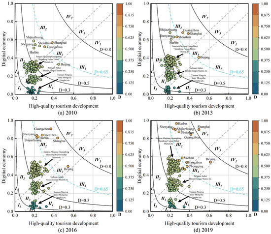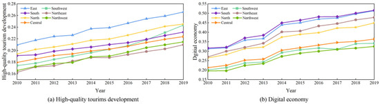 The results of the comprehensive evaluation of HQTD and DE in Chinese prefecture-level cities are shown in Figure 3a–d, which display the results for the years 2010, 2013, 2016, and 2019. Figure 4a illustrates the trends of HQTD and DE across different regions. According to Figure 3a–d, cites with higher levels of HQTD are mainly concentrated in developed regions. In 2010, only three cities, Beijing, Shanghai, and Guangzhou, exceeded 0.3. By 2019, HQTD levels in these cities continue to rise, with Beijing exceeding 0.6. Other cities with notable increases in HQTD are mainly provincial capitals or municipalities directly under the Central Government, such as Hangzhou, Chengdu, Kunming, Wuhan, Chongqing, and Tianjin, as well as tourist-rich cities like Lijiang and Huangshan. Overall, the level of HQTD remains relatively low across most cities in China. This is largely because tourism development during 2010–2019 is primarily measured in terms of economic benefits, with less focus on the broader development of high-quality tourism. However, Figure 4 indicates HQTDs across all regions are increasing annually. The HQTD is highest in the western region, followed by the northern and southern regions. Before 2016, HQTD levels in the southwestern region remained at a medium-to-low level but rose rapidly thereafter. This spatial imbalance is consistent with existing research showing that eastern and coastal regions, supported by stronger economies and industrial structures, generally achieve higher levels of tourism development [74]. Compared with earlier studies, the present analysis highlights intra-regional heterogeneity and shows that western cities have accelerated since 2016, reflecting the role of emerging industries and policy support [75]. These findings suggest that regional disparities remain pronounced, yet the dynamic growth in the west indicates a gradual narrowing of the gap. Compared with studies focusing on provincial or national scales [76], the city-level analysis in this study provides more granular insights, revealing intra-regional heterogeneity in digital economy development.