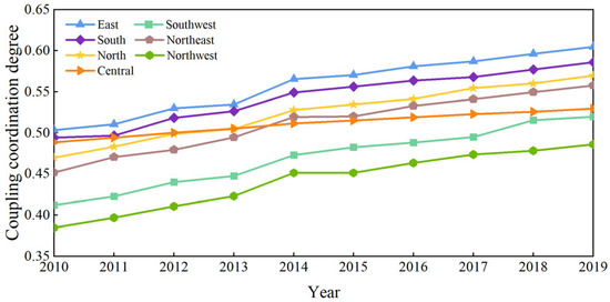 Figure 5 demonstrates the average coupling coordination degree (CCD) between the HQTD and DE across different regions from 2010 to 2019. While the CCD shows an overall upward trend during this period, regional variations are evident. The CCD in the eastern region is consistently above 0.5, maintaining a bare balanced status, with a pronounced upward trend, reaching an average CCD of nearly 0.6 in 2019. The trend in CCD values in the southern region is similar to the eastern region, though the values are slightly lower. The CCD growth in the central region is the lowest, remaining at approximately 0.5 throughout the entire study period. The CCD in the northwest region is the lowest, at only 0.45 in 2019, primarily due to the underdevelopment of both the tourism and digital industries in the region.