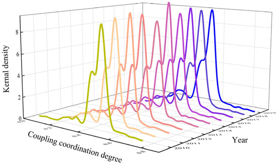 For exploring the characteristics of the evolution in temporal coordination of the coupling between high-quality tourism development and the digital economy over time. Kernel density estimation is a nonparametric statistical method for estimating the unknown form of the probability density function, which does not require the assumption that the unknown variable needs to conform to a defined distribution. It estimates the probability density function by placing a kernel function (e.g., a Gaussian kernel function) around each data point and estimating the probability density function by taking a weighted average of them, thus estimating the probability density function of a random variable more accurately. The formula is as follows [70]: