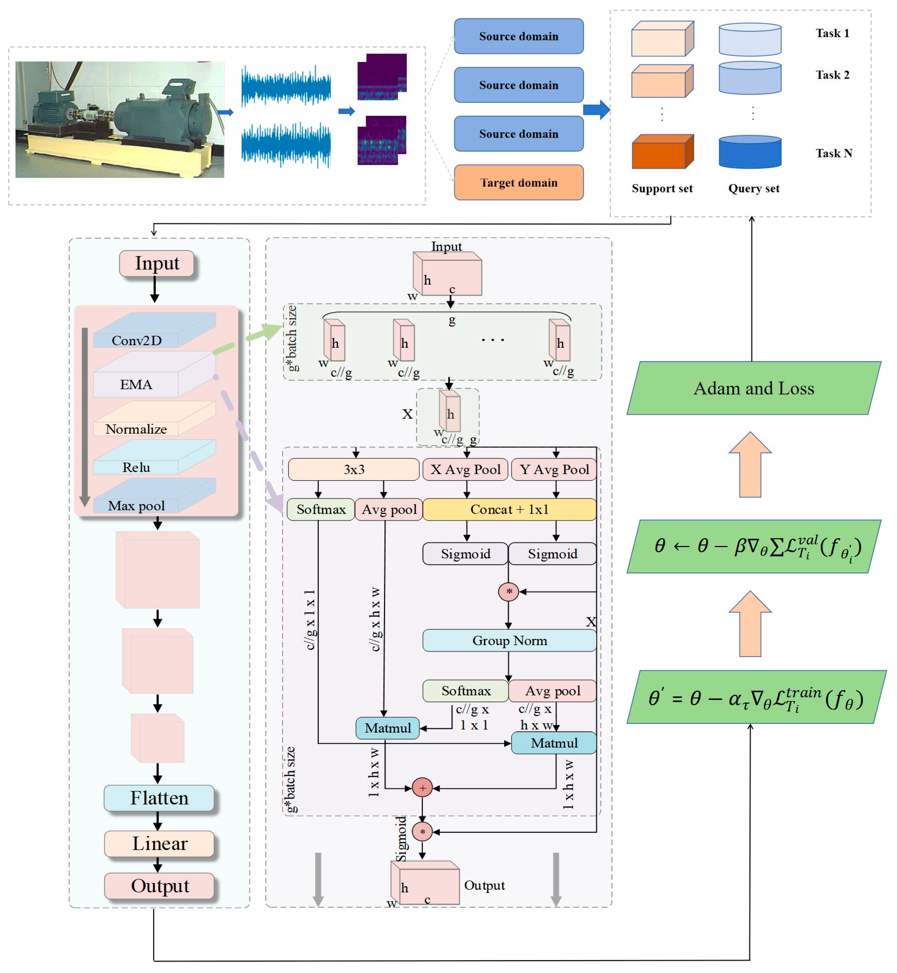 Although the above methods perform well across different tasks and operating conditions, the traditional MAML algorithm still has certain limitations, particularly when applied to cross-domain tasks. the inner-loop learning rate in MAML is fixed and does not adjust dynamically with the complexity of the task or changes in the data. This rigid learning rate strategy limits the model’s ability to adapt and generalize in more intricate and fluctuating task scenarios. Moreover, the varying complexity of bearing equipment operating conditions introduces challenges for fault diagnosis, especially in relation to cross-domain generalization. There are often notable differences in data distribution between the source and target domains, which makes it difficult to apply models trained on the source domain directly to the target domain, thus affecting diagnostic performance [