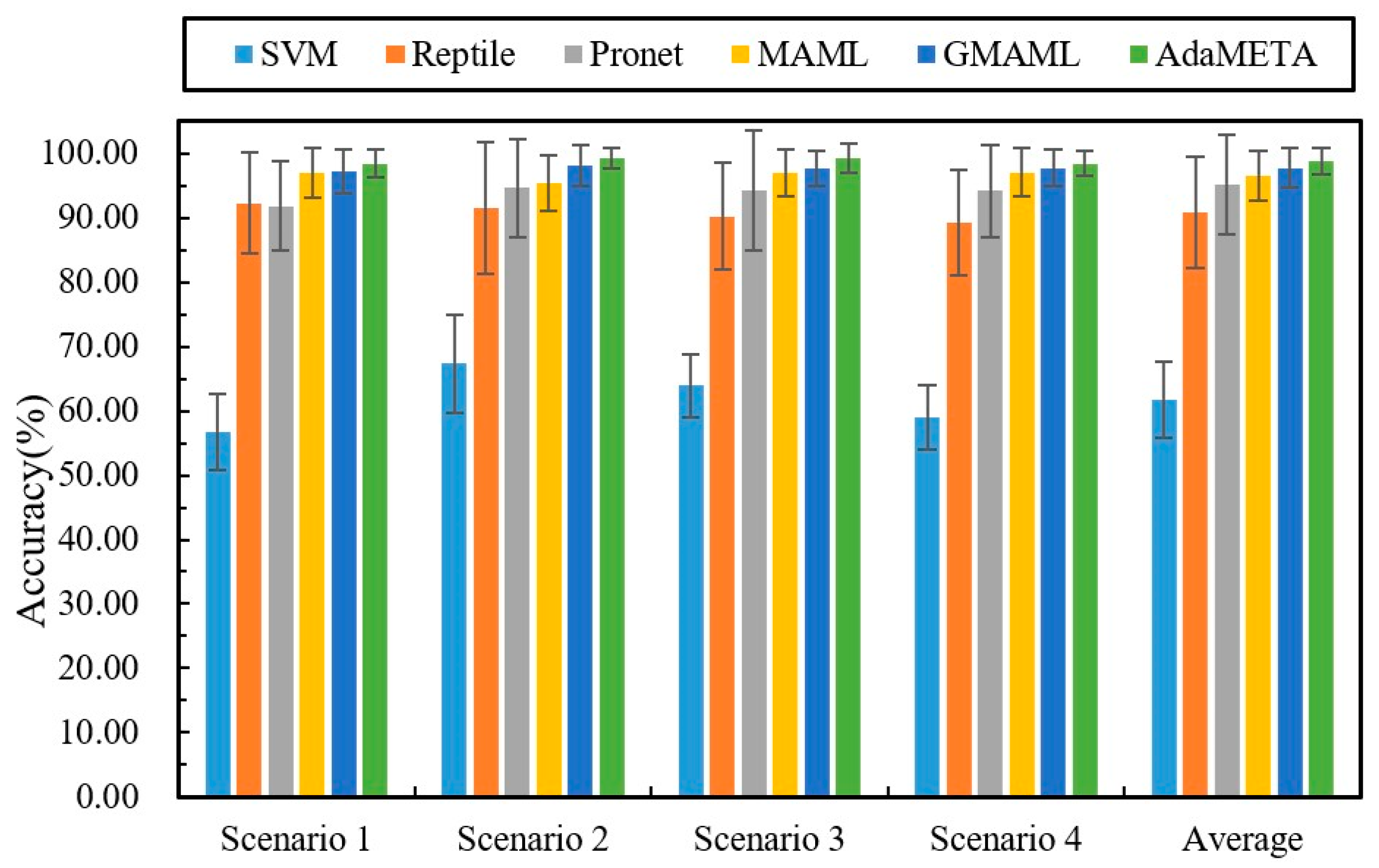 The comparative results demonstrate that, in the few-shot cross-domain fault diagnosis knowledge transfer setting, meta-learning frameworks significantly outperform traditional machine learning and conventional deep learning methods. Using Support Vector Machine (SVM) as a benchmark, the average diagnostic accuracy across the four load scenarios is only 61.75%, with the best performance in Scenario 2 at 67.35%. In contrast, under the same conditions, the four meta-learning models—Reptile, ProNet, MAML, and GMAML—achieved average accuracies of 90.8%, 95.2%, 96.56%, and 97.68%, respectively. This performance gap arises because meta-learning algorithms emphasize cross-task transfer and rapid adaptation during training, rather than overfitting to individual samples, enabling efficient and robust fault identification even in cases where target-domain samples are scarce.