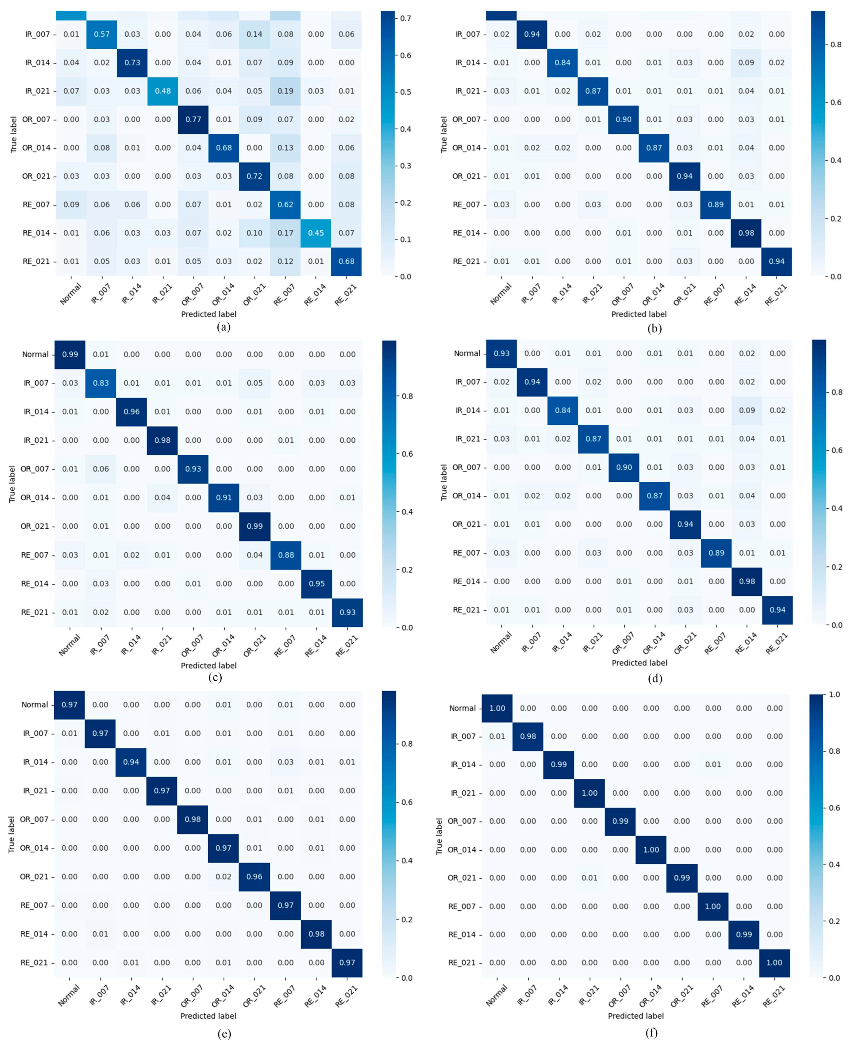 This experiment is based on the CWRU dataset, utilizing the vibration data collected simultaneously from both the drive end (DE) and fan end (FE). Although the same bearing system is monitored, inherent differences in vibration signals arise due to variations in the mechanical sensor mounting positions, including differences in signal propagation paths, attenuation characteristics, and signal-to-noise ratios. These variations result in significant data distribution shifts, providing an ideal and realistic “cross-domain” validation platform.