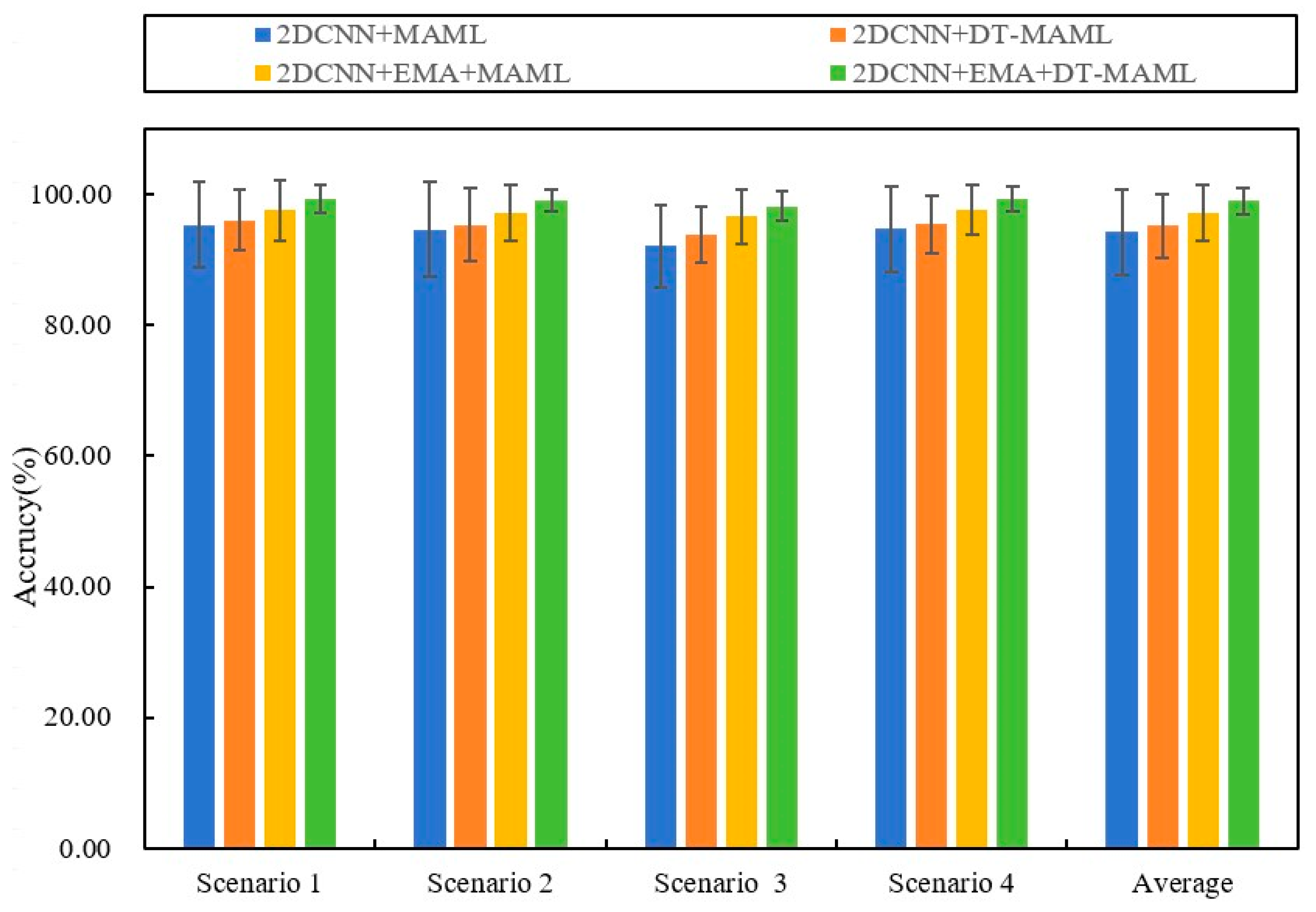 The experimental data revealed significant performance differences across scenarios. In Scenario 1, 2DCNN+EMA+DT-MAML performed best, with an accuracy of 98.37 ± 2.17%, significantly outperforming the other methods. A similar trend was observed in Scenario 2, where 2DCNN+EMA+DT-MAML attained 99.16 ± 1.62% accuracy, again exceeding the other combinations. In Scenarios 3 and 4, 2DCNN+EMA+DT-MAML continued to perform strongly, achieving 99.26 ± 2.31% and 98.39 ± 1.88% accuracy, respectively, and remaining significantly higher than the models that did not include EMA or DT.